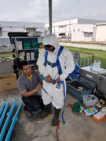 - โดยพนักงานที่ผ่านการฝึกอบรมการทำงานที่อับอากาศ ( Confined space )